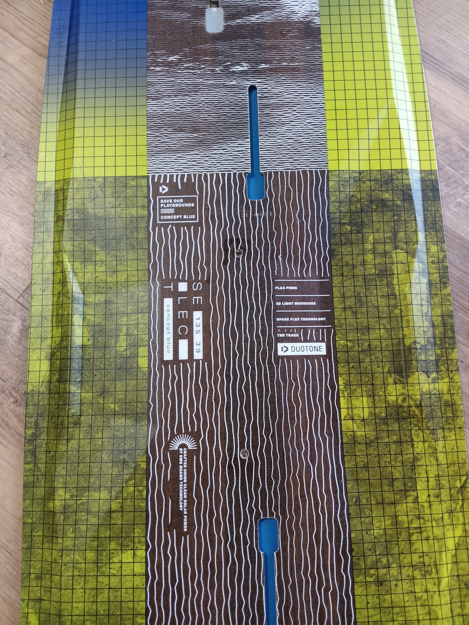 Demo Duotone Select Concept Blue 135 / 39. Board w/fins. and four 6mm track nuts for bindings. In used condition with small cosmetic imperfections.
