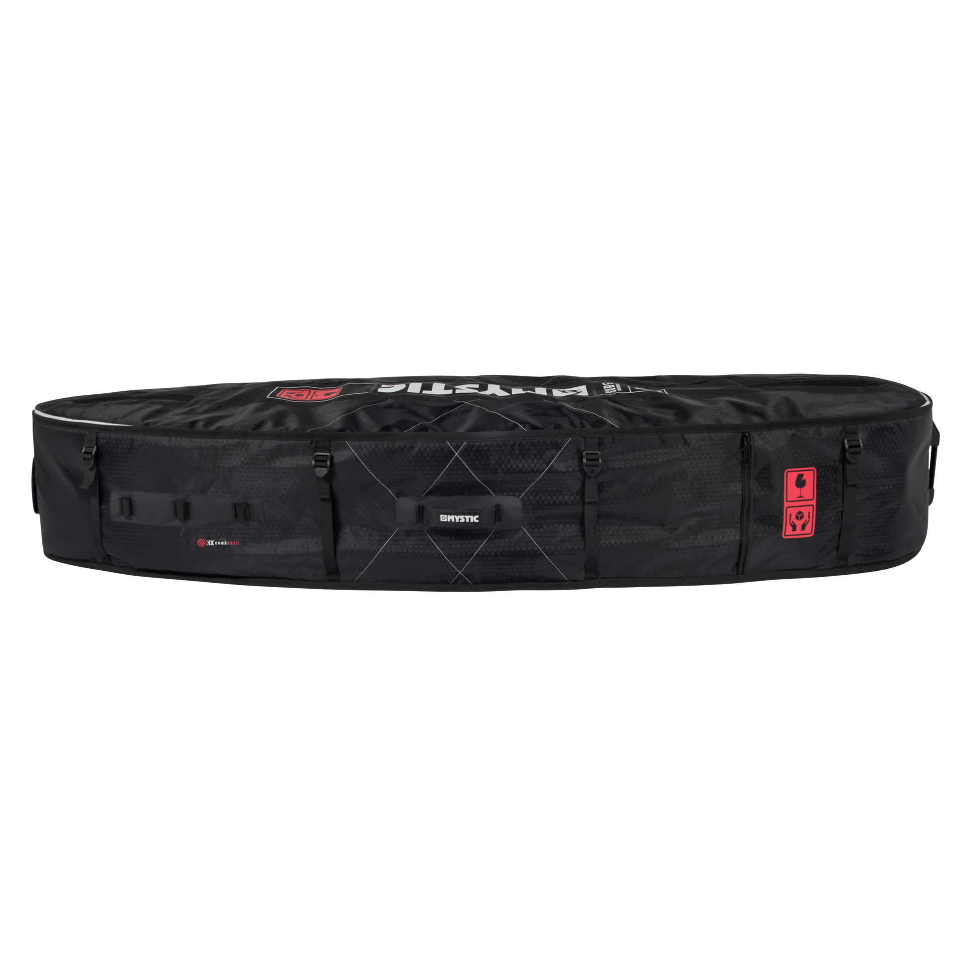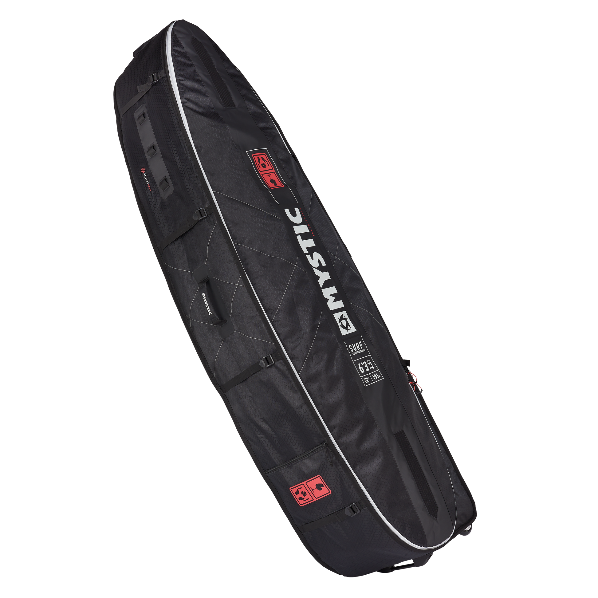The Mystic Surf Pro is the perfect companion to bring your surfboards on your dream trip. Fits surfboards up to 6'3 and 3+ kites. Extra protection and padding on the inside prevent wear from the sharp edges of your fins and the 3D mesh airvents keep your gear fresh! The XL wheels on the side of the boardbag makes it easy to stroll around the airport without killing your arms.