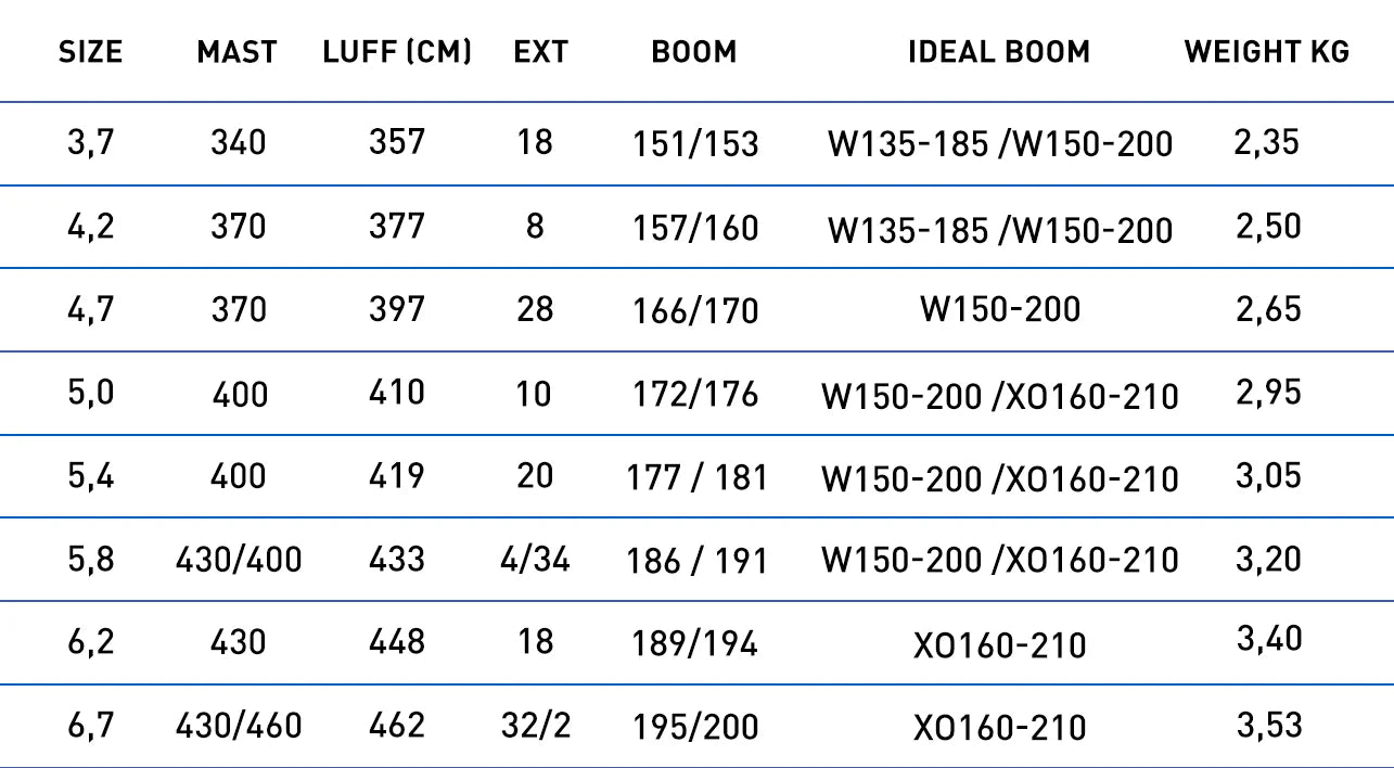 The 3.7 to 5.8 sizes are power wave sails with incredibly low swing weight, ideal for jumping and attacking waves with their light weight, stable power, and speed. The 6.2 and 6.7 sizes are free-move sails, perfect for flatwater freeriding with stability, top-end speed, a huge wind range, and easy upwind sailing.